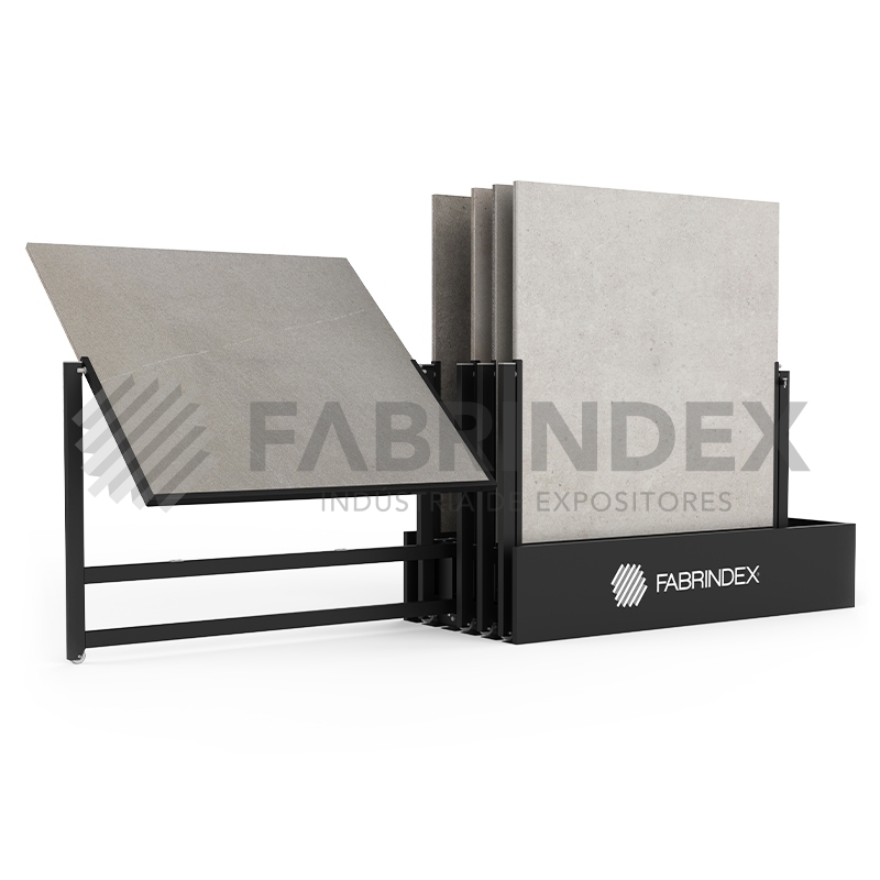 Expositor para expor peças de revestimento e pavimento cerâmico em Lojas e Showrooms. Estrutura com carros deslizantes e rotativos de dupla face para peças soltas.