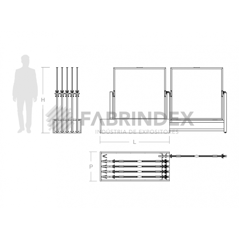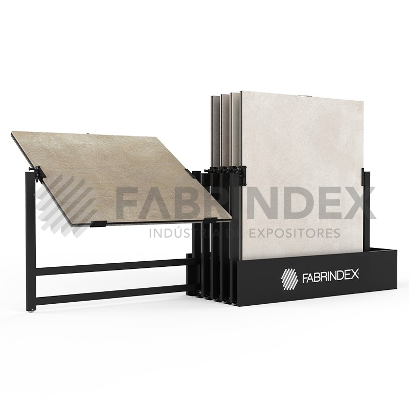 Expositor para expor peças de revestimento e pavimento cerâmico em Lojas e Showrooms. Estrutura com carros deslizantes e rotativos de dupla face para peças soltas.