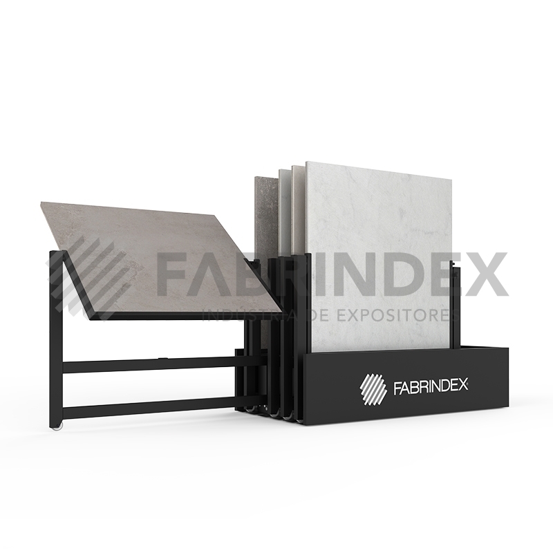 Expositor para expor peças de revestimento e pavimento cerâmico em Lojas e Showrooms. Estrutura com carros deslizantes e rotativos de dupla face para peças soltas.
