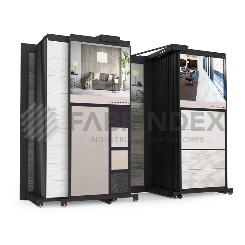 Expositor para expor revestimento e pavimento cerâmico em Lojas e Showrooms. Com modelos de 24, 28, 32, 36 painéis deslizantes de uma face e 3 painéis fixos.