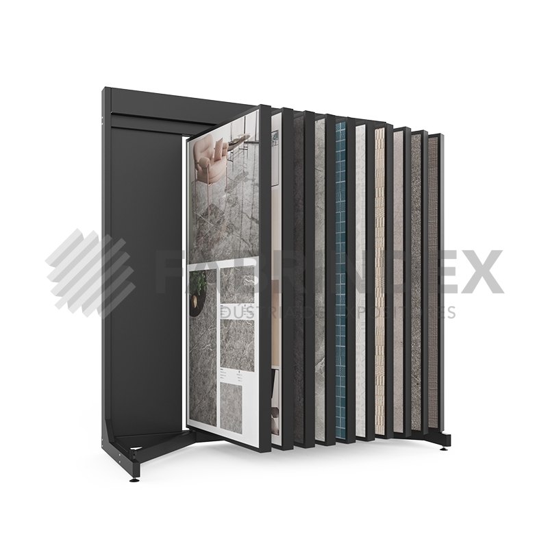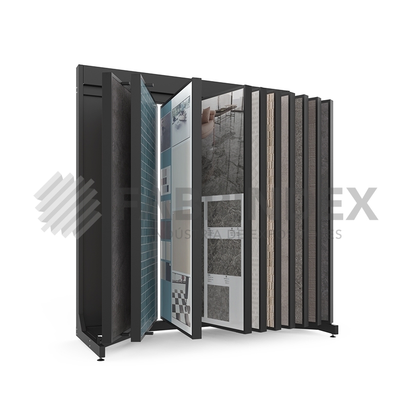 Expositor para expor revestimento e pavimento cerâmico em Lojas e Showrooms.Com 10 aros de dupla face, para movimento em formato de livro.