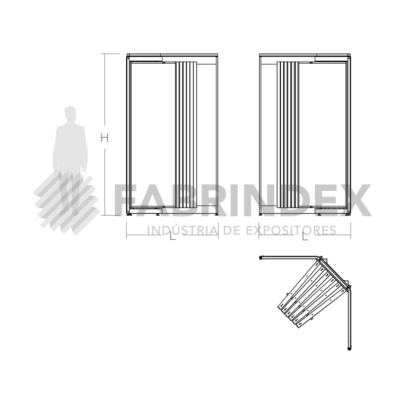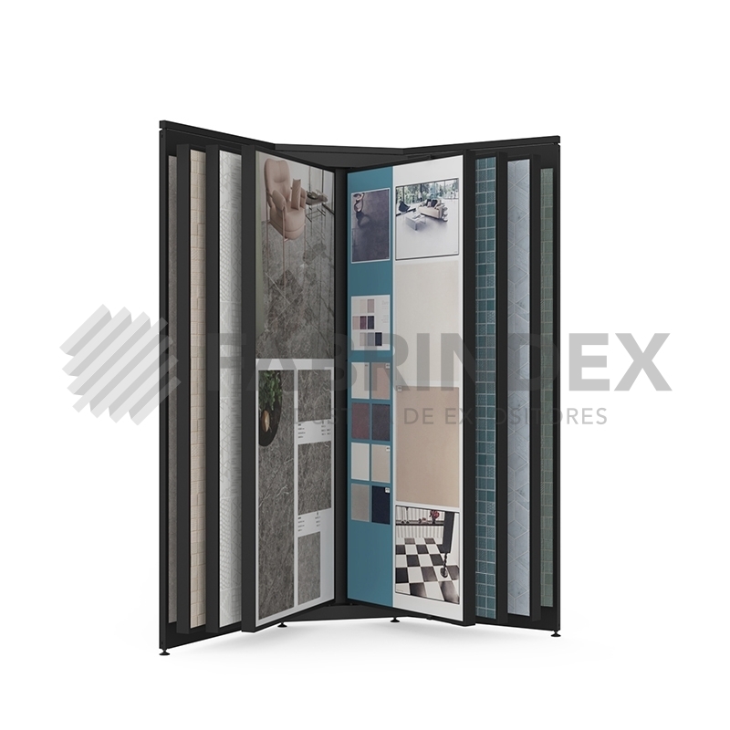 Expositor de canto para expor revestimento e pavimento cerâmico em Lojas e Showrooms. Com 12 painéis rotativos de dupla face e 2 painéis fixos.