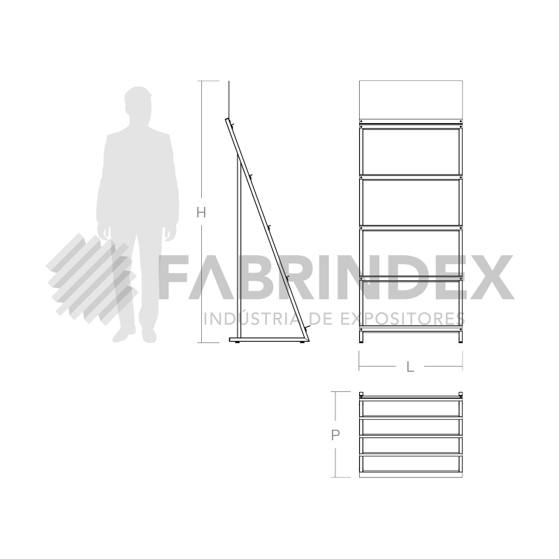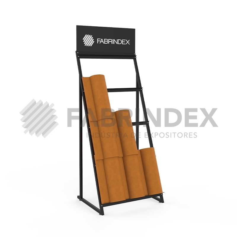 Expositor para telhas com 4 níveis e pala superior para colocar o logótipo/marca. Comunicação/marca não incluída.